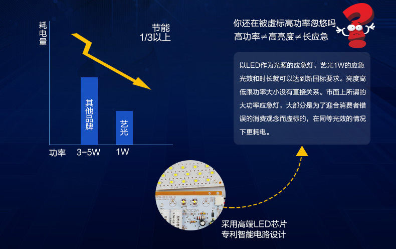 1、低功率、高亮度,更高效節(jié)能,藝光消防應(yīng)急筒燈1612只需要1W的功率,便可以達(dá)到新國(guó)標(biāo)要求,更穩(wěn)定、高效,亮度與功率沒(méi)有直接關(guān)系,這也是為什么藝光消防應(yīng)急筒燈1612只有1W的功率去可以做到高亮度發(fā)光的原因!